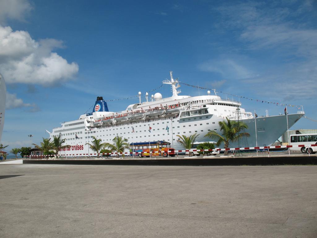 Aruba was our final port of call. We hooked up with Darin and Tim and spent the afternoon wandering about town. Aruba seemed the most modern of all the ports of call, and reminded us of being in Miami or Key West. Definitely some place we wouldn't mind spending a long weekend at. There was also a bear catamaran excursion that day we heard was a lot fun, despite a couple of broken bones due to a rope swing. That afternoon, I brought my camera down by the bear pool (the Terrace pool on desk 15, aft). That evening we had reservations at Sabatinni's, the onboard specialty Italian restaurant. Joining us were several other guys, namely Don, Petey and Mark, Steve and Ernesto, and Bart. A very nice, very large meal ending in the dessert pictured below. Click on a thumbnail for a larger picture.