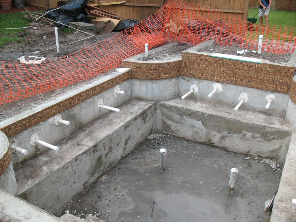 Early this morning the plumbers finished off the pipe work. None of the ditches were backfilled yet, we assume so Seminole County can inspect their work. We also went back to the statuary place in Bithlo to look at the completed scupper bowls. They came out perfect! A sample of the pavers to be used on our patio can be seen next to one of the bowls. Finally, we stopped by Old Time Pottery and picked up some stuff for the patio, including the pictured fire pit. Also pictured is the finished planter in the other back corner of the back yard.